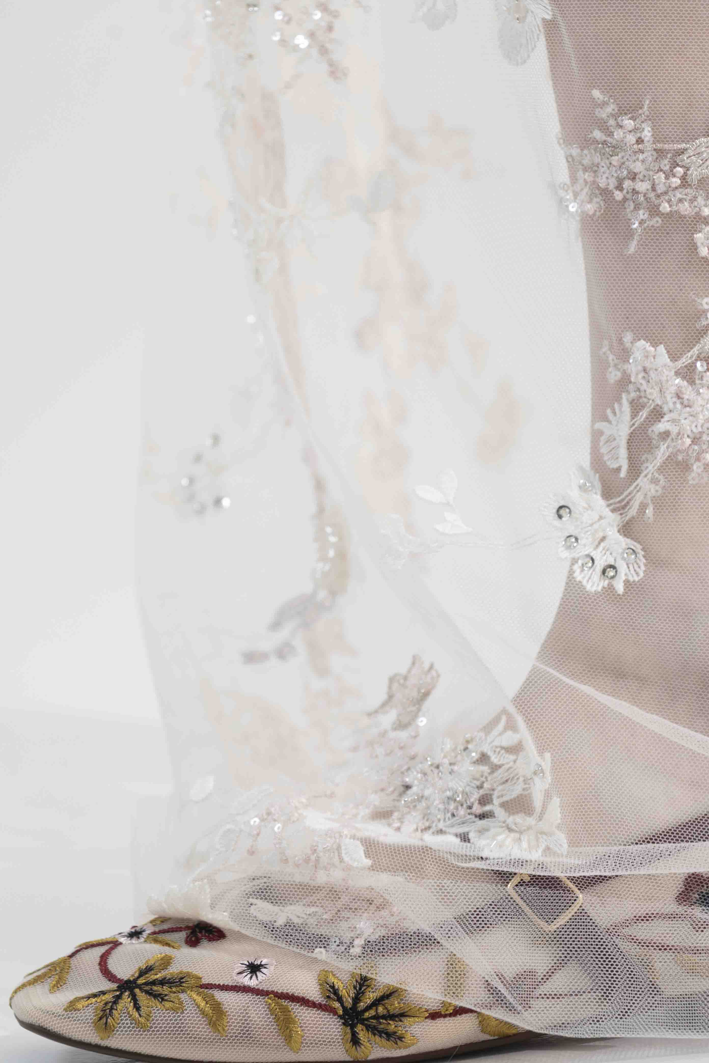 Une partie des pièces intègre de la dentelle de Calais, certifiée en France, produite par un nombre très limité d’ateliers encore autorisés à la fabriquer. Ce niveau de rareté confère à ces matières une valeur singulière, à la fois fragile et précieuse.